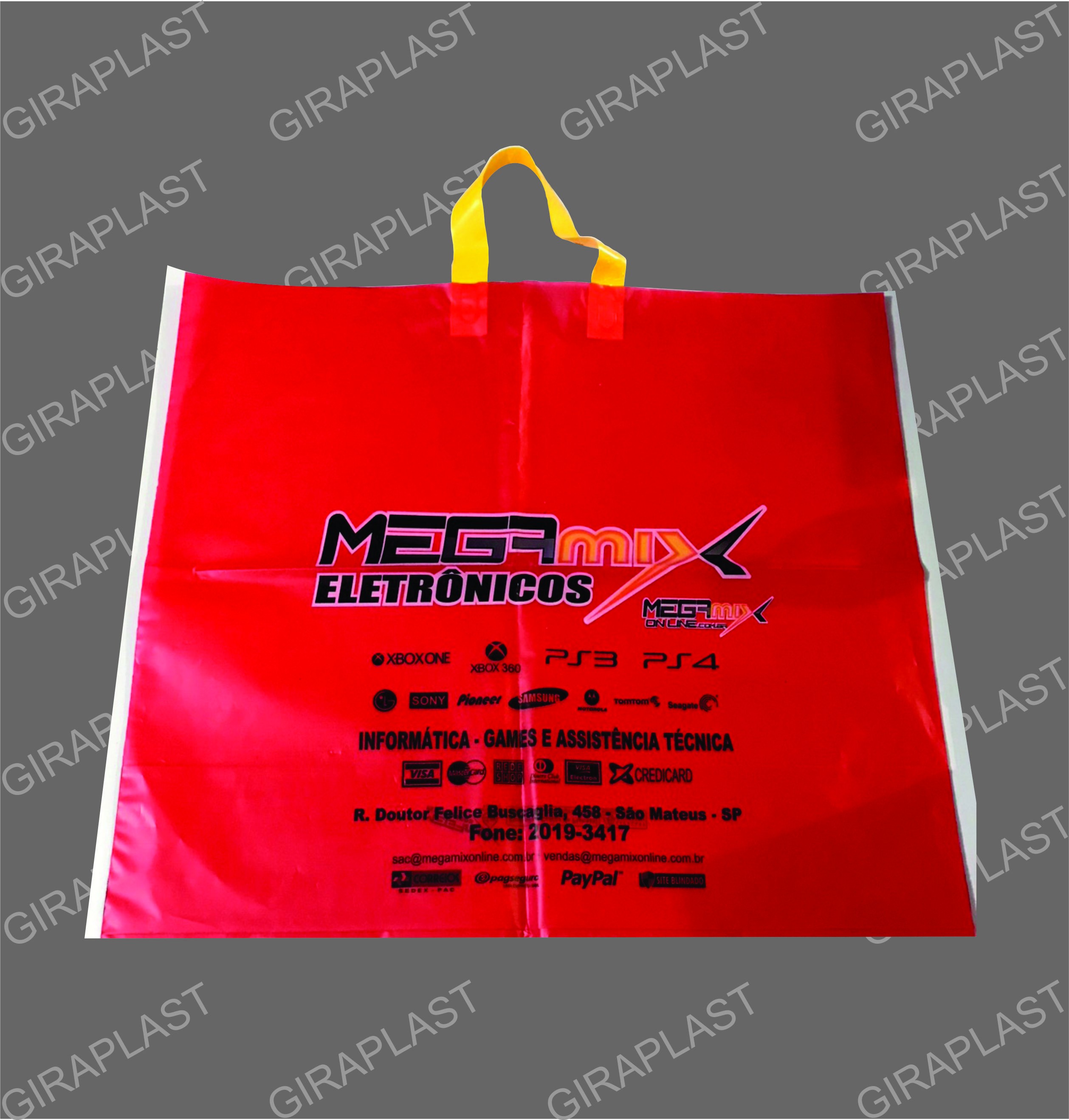 A Giraplast também comercializa a sacola alça camiseta utilizada em vários segmentos, como o de roupas e o de calçados. É uma sacola adequada para guardar poucas peças de roupas e calçados para crianças, pois são pequenas e discretas, deixando o consumidor confortável.
